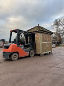 Collecting the granary proved tricky. Using a large telehandler, we were slightly concerned about the overall height of the load on the lorry making its way back to our reclamation yard in Glastonbury 🫣